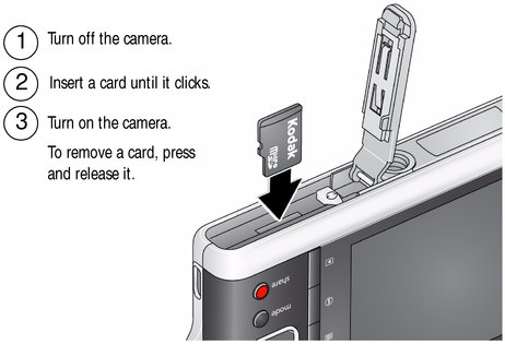 CAUTION: A card can only be inserted one way; forcing it may cause damage. Inserting or removing a card while the camera is on may damage the pictures, the card, or the camera. |