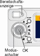 Drehen Sie den Modusschalter von der Position "Off" (Aus) auf eine andere Position. Die Bereitschaftsanzeige blinkt, während die Kamera eine Selbstdiagnose durchführt. Die Anzeige leuchtet grün, wenn die Kamera einsatzbereit für die Aufnahme von Bildern ist (oder für die Videoaufzeichnung, wenn der Modusschalter auf gestellt ist.)