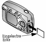 VORSICHT: Die Karte passt nur in einer Ausrichtung in die Kamera. Wird sie mit Gewalt eingeschoben, können Kamera oder Karte beschädigt werden. Die Karte darf nicht eingesetzt oder entnommen werden, solange die grüne Bereitschaftslampe blinkt. Andernfalls können Bilder, die Karte oder die Kamera selbst Schaden nehmen. |