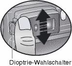 Drehen Sie den Dioptrie-Wahlschalter mit dem linken Daumen so lange, bis das Bild im Sucher scharf gestellt ist.
