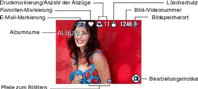 Bilder und Videos werden mit entsprechenden Symbolen angezeigt. Drücken Sie die Display-/Infotaste für folgende Aktionen: