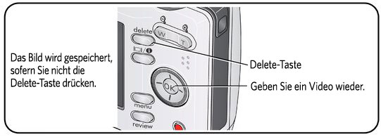 Nachdem Sie ein Bild oder Video aufgenommen haben, wird auf dem LCD-Display etwa zehn Sekunden lang eine Schnellansicht des Bilds oder Videos angezeigt. (Beenden Sie die Schnellansicht vor Ablauf dieser Zeit, indem Sie den Auslöser halb herunterdrücken.)