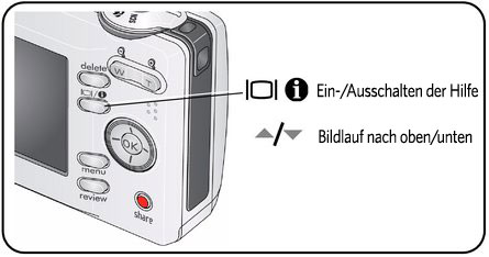 Machen Sie sich mit den Optionen der einzelnen Menüs vertraut, indem Sie die Hilfe der Kamera verwenden. Markieren Sie eine Menüoption, und drücken Sie die LCD-/Infotaste
