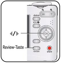 Drücken Sie die Review-Taste, um Bilder und Videos anzuzeigen und zu bearbeiten. Drücken Sie die Review-Taste erneut, um das Menü zu beenden.