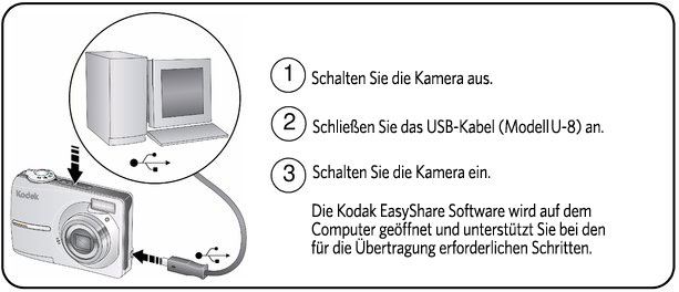 | HINWEIS: | Ein Online-Lernprogramm zum Herstellen der Verbindung finden Sie im Internet unter www.kodak.com/go/howto. |