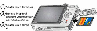 VORSICHT: Die Karte kann nur in einer bestimmten Richtung in die Kamera eingeschoben werden. Gewaltsames Einschieben einer falsch ausgerichteten Karte kann die Kamera oder die Speicherkarte beschädigen. Wenn Sie eine Karte einlegen oder entfernen, während die Kamera darauf zugreift, könnte dies zu Beschädigungen der Karte, der Bilder oder der Kamera führen. |
