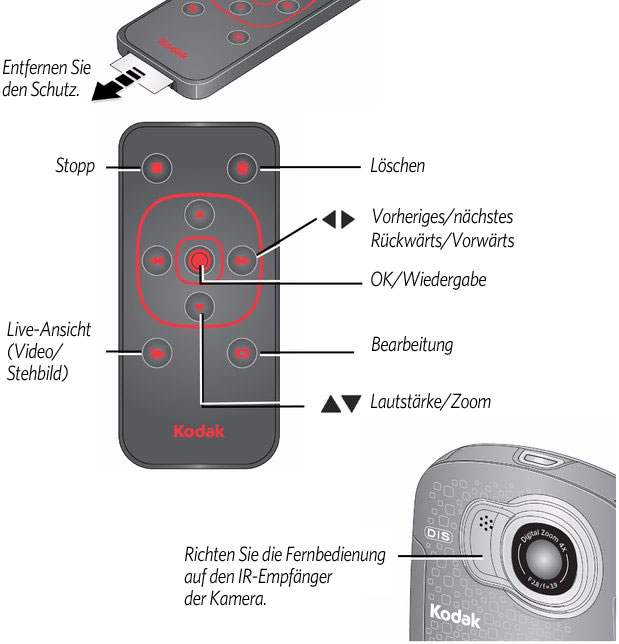Verwenden Sie die optionale Fernbedienung, um die Videos und Bilder zu betrachten. Rufen Sie folgende Website auf: www.kodak.com/go/accessories.