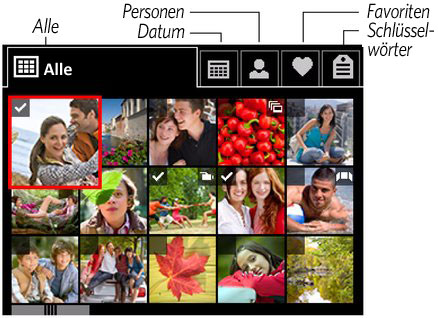 , um eine Registerkarte auszuwählen und Bilder / Videos nach „Alle“, „Datum“, „Personen“, „Favorit“ oder „Schlüsselwort“ zu sortieren. -