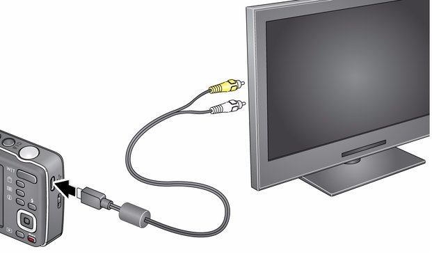 Bilder und Videos können auf einem Fernseher, Computerbildschirm oder einem beliebigen anderen Gerät angezeigt werden, das über einen Videoeingang verfügt. Schließen Sie die Kamera mit Hilfe eines AV-Kabels (möglicherweise separat erhältlich) direkt an einen Fernseher an.