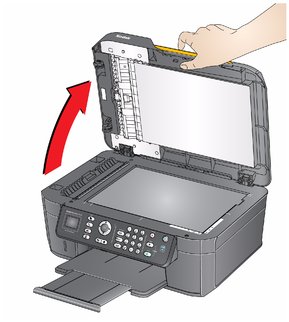 Reinigen Sie die Rückseite der Scannerabdeckung mit einem weichen Tuch oder Schwamm und einer milden Seifenlösung und warmem Wasser.