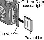 CAUTION: The Picture Card can only be inserted one way into the camera. Do not force the card. It may damage your camera. Do not insert or remove a Picture Card when the Picture Card access light is blinking. Doing so may damage your pictures, Picture Card, or camera. |
