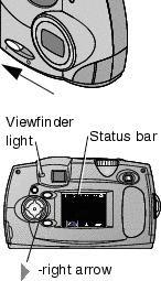 The lens extends to the Wide Angle position and the viewfinder light blinks green while the camera performs a self-check. When the viewfinder light glows steady green (and the Mode dial is set to Still or Video ) the camera is ready to take pictures or videos. A screen message informs you which storage location is being accessed: the camera's internal memory or a Picture Card. See Choosing Internal Memory or Picture Card for storage location information. In Still or Video modes, the status bar is briefly displayed on the LCD. |