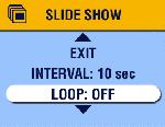 The loop slide show begins immediately. It repeats continuously until you cancel it by pressing the Select button or until battery power is exhausted. Loop reverts to Off when the loop slide show stops. |