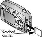 CAUTION: The card can only be inserted one way; forcing it may damage the camera or card. Do not insert or remove a card when the green ready light is blinking; it may damage your pictures, card, or camera. |
