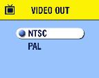 The Video Out feature lets you match the camera's video signal to the standard for your location. Video Out must be set correctly to run a slide show on an external device (see Displaying Pictures on a Television).