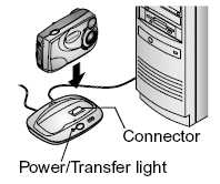 The Power/Transfer light glows green when the camera is properly seated. The camera is now powered by the Camera Dock instead of the camera batteries.