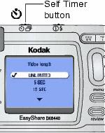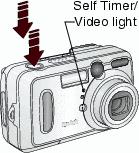 The Self Timer/Video light blinks slowly for 8 seconds, then quickly for 2 seconds before the video begins recording. It then stays on while recording. To cancel the Self Timer before the video is taken, press the Self Timer button. (The Self Timer setting remains active.) To turn off the Self Timer, press the Self Timer button twice. |