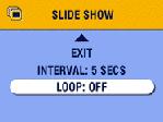 to highlight On, then press the OK button. When you start a slide show, it repeats until you cancel it by pressing the OK button or until battery power is exhausted. The Loop setting remains until you change it. |