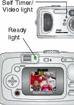 The Ready light blinks green, REC appears on the camera screen, and the Self Timer/Video light stays on. |