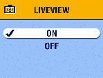 Liveview is now On by default. The camera screen is on whenever the camera is on (in Still or Video mode). You can still press the OK button to turn Liveview off and on. |