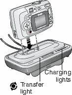 The Transfer light glows green when the camera is seated. If a rechargeable battery is in the camera, the first battery charging light glows green. The camera is now powered by the camera dock instead of the camera batteries.
