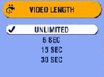 You can specify a time limit for your videos. The Video Length setting is useful if you wish to conserve space in the camera's internal memory or on a card, or if you want all of your videos to be the same length.