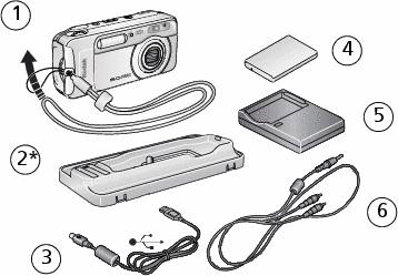 Not shown: User's guide (may be provided on a CD), Start Here! guide, Kodak EasyShare software CD. Contents may change without notice.