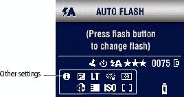 button. The current camera status icons are displayed in the bottom half of the Flash screen.