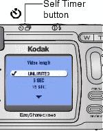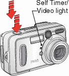 The Self Timer/Video light blinks slowly for 8 seconds, then quickly for 2 seconds before the video begins recording. It then stays on while recording. To cancel the Self Timer before the video is taken, press the Self Timer button. (The Self Timer setting remains active.) To turn off the Self Timer, press the Self Timer button twice. |