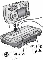 The Transfer light glows green when the camera is seated. If a rechargeable battery is in the camera, the first battery charging light glows green. The camera is now powered by the camera dock instead of the camera batteries.