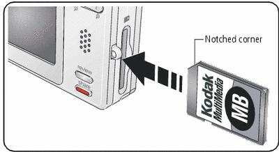 | NOTE: | We recommend Kodak SD or MMC cards. When using the card for the first time, format it in this camera before taking pictures (see ). |