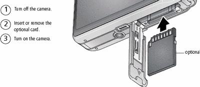 CAUTION: A card can only be inserted one way; forcing it may cause damage. Inserting or removing a card while it is being accessed may damage the pictures, the card, or the camera. |