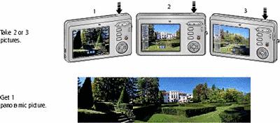 | NOTE: | For best results, use a tripod. Only the panoramic picture is saved; individual pictures are not. (Picture size is set to 5.0 MP. Exposure and white balance are set with the first picture. The flash is set to Off.) |