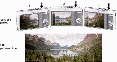 | NOTE: | For best results, use a tripod. Only the panoramic picture is saved; individual pictures are not. (Exposure and white balance are set with the first picture. The flash is set to Off.) |