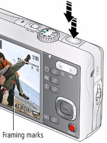 Press the Shutter button halfway to focus and set exposure. When the framing marks turn green, press the Shutter button completely down.