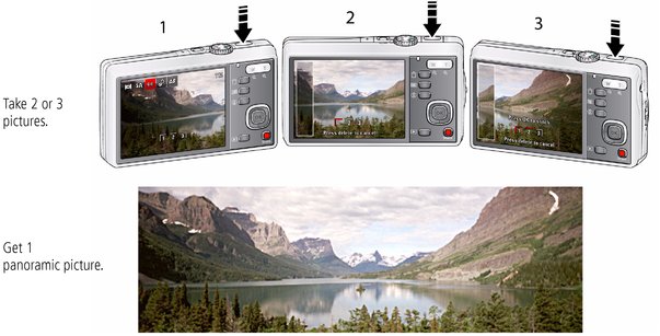 | NOTE: | For best results, use a tripod. Only the panoramic picture is saved; individual pictures are not. (Exposure and white balance are set with the first picture. The flash is set to Off.) |