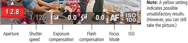 Shutter Speed - control how long the shutter stays open. (To prevent blur, use a tripod for slow shutter speeds.) Exposure Compensation - adjust the exposure. If the picture is too light, decrease the setting; if it's too dark, increase the setting. Flash Compensation - adjust flash brightness. Focus Mode - choose Auto, Close-up, Landscape, or Manual Focus. ISO - adjust the camera's sensitivity to light. Higher ISO indicates greater sensitivity. |