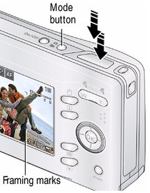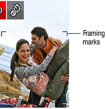 Framing marks indicate the camera focus area. In Auto mode (and in SCN modes designed for pictures of people), the camera attempts to focus on faces.