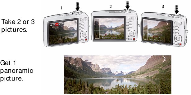 NOTE: | For best results, use a tripod. Only the panoramic picture is saved; individual pictures are not. (Exposure and white balance are set with the first picture. The flash is set to Off.) |
