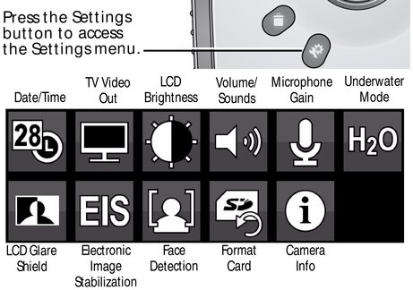 Date/Time - Set the date/time. TV Video Out - Choose the setting (NTSC, PAL) for your region. LCD Brightness - Set LCD brightness. (Auto lets the camera set it for you.) Volume/Sounds - Turn sounds on/off. (When the Video Recording light turns off.)
