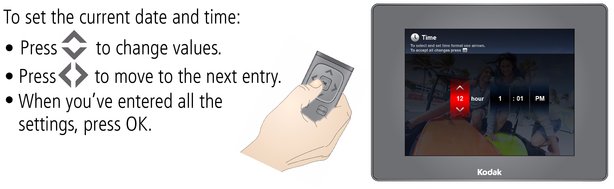 The first time you turn on your frame, the Time, Date, and On/Off screens appear automatically after you select your language.