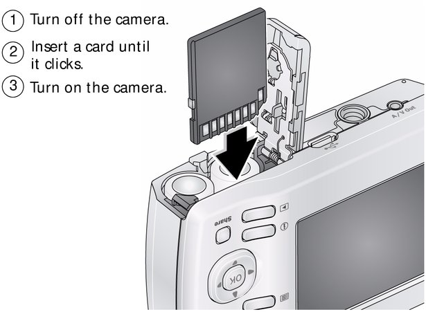 CAUTION: A card can only be inserted one way; forcing it may cause damage. Inserting or removing a card while the camera is on may damage the pictures, the card, or the camera. |