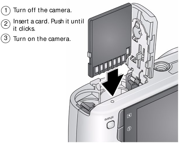 CAUTION: A card can only be inserted one way; forcing it may cause damage. Inserting or removing a card while the camera is on may damage the pictures, the card, or the camera. |