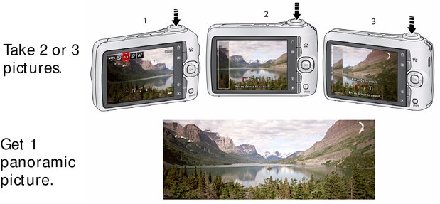 NOTE: | For best results, use a tripod. Only the panoramic picture is saved; individual pictures are not. (Exposure and white balance are set with the first picture. The flash is set to Off.) |