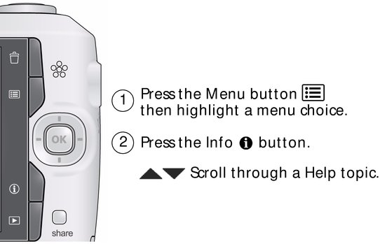 Your camera offers a built-in Help system. It describes every setting for every menu choice. If you learn nothing else about your camera, learn how to use on-camera Help.