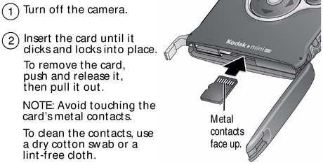 CAUTION: A card can only be inserted one way; forcing it may cause damage. Inserting or removing a card while the camera is on may damage the video/pictures, the card, or the camera. |