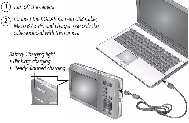 | IMPORTANT: | The camera charges when the computer is on and awake. Turn off the computer's hibernation, sleep, and standby modes. |