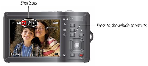 Press  to access functions like Exposure Compensation, Self-timer, and Auto focus in Capture mode. In Review mode, access People Tags and Keyword Tags. (You'll see different functions in different modes.) to access functions like Exposure Compensation, Self-timer, and Auto focus in Capture mode. In Review mode, access People Tags and Keyword Tags. (You'll see different functions in different modes.)