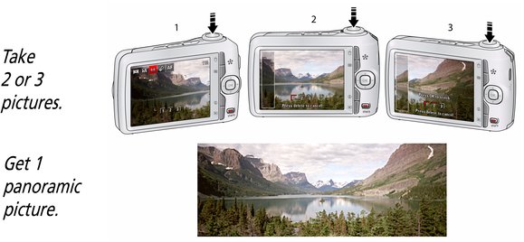 | NOTE: | Only the panoramic picture is saved; individual pictures are not. (Exposure and white balance are set with the first picture. The flash is set to Off.) |