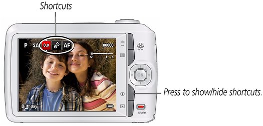 to access functions like Exposure Compensation, Self-timer, and Auto focus in Capture mode. In Review mode, access People Tags and Keyword Tags. (You'll see different functions in different modes.) -